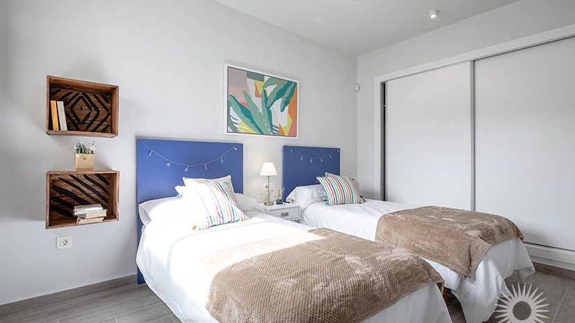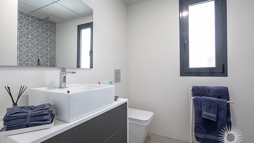 Das Erdgeschoss besteht aus einer offenen Küche /Essbereich, Wohnzimmer mit Zugang zur Terrasse, Hauptschlafzimmer mit en-suite, zwei weiteren Schlafzimmern und einem Gäste-WC. Eine Treppe führt zu einem 53 m² großen privaten Dachsolarium.