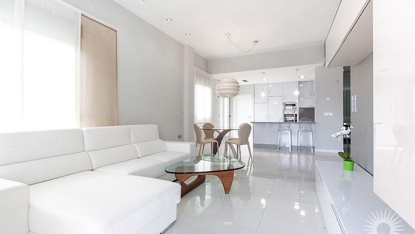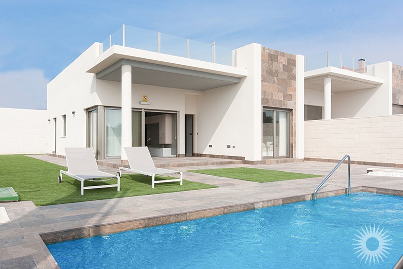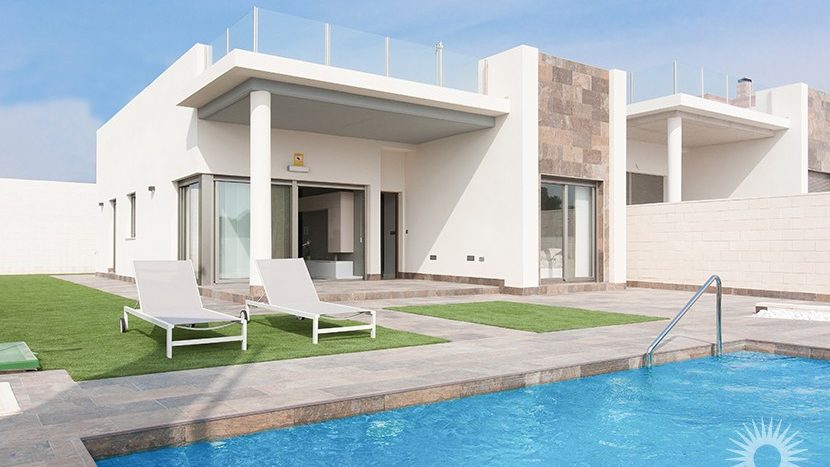 Die Immobilien bestehen aus einem geräumigen Wohn-/Esszimmer, einer offenen Küche mit angrenzendem Hauswirtschaftsraum, einem Hauptschlafzimmer mit eigenem Badezimmer, zwei weiteren Doppelschlafzimmern und einem Gäste-WC. Die Terrassentüren des Wohnzimmers führen auf eine geräumige Außenterrasse, einen Garten und einen privaten Swimmingpool. Eine Außentreppe Führt zu Einem 104 m² großen privaten Solarium mit Blick auf den Salzsee und den ganzen Tag über Sonnenschein.