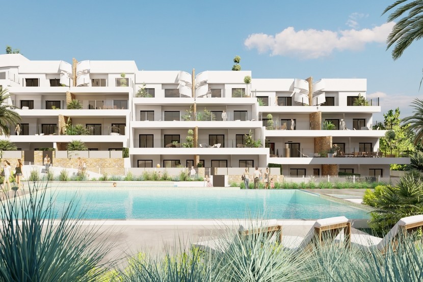 Diese Apartments bestehen aus einem geräumigen Wohnzimmer, einer offenen Küche, einem Essbereich, einem Hauptschlafzimmer mit Einbauschränken und eigenem Bad, einem weiteren Schlafzimmer, ebenfalls mit Einbauschränken, und einem Gästebad. Terrassentüren von der Lounge führen auf eine große, 33 m² große private Terrasse, auf der Sie den ganzen Tag Sonne genießen können.